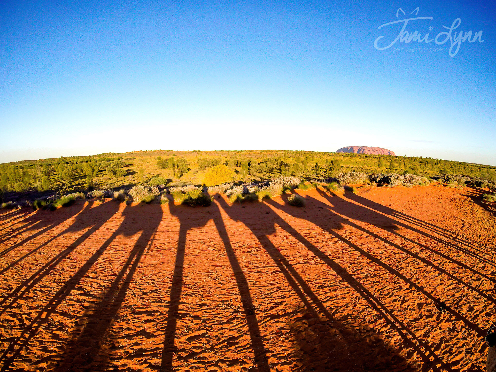 Camel Tour at sunset through the Australian outback with Uluru in the background